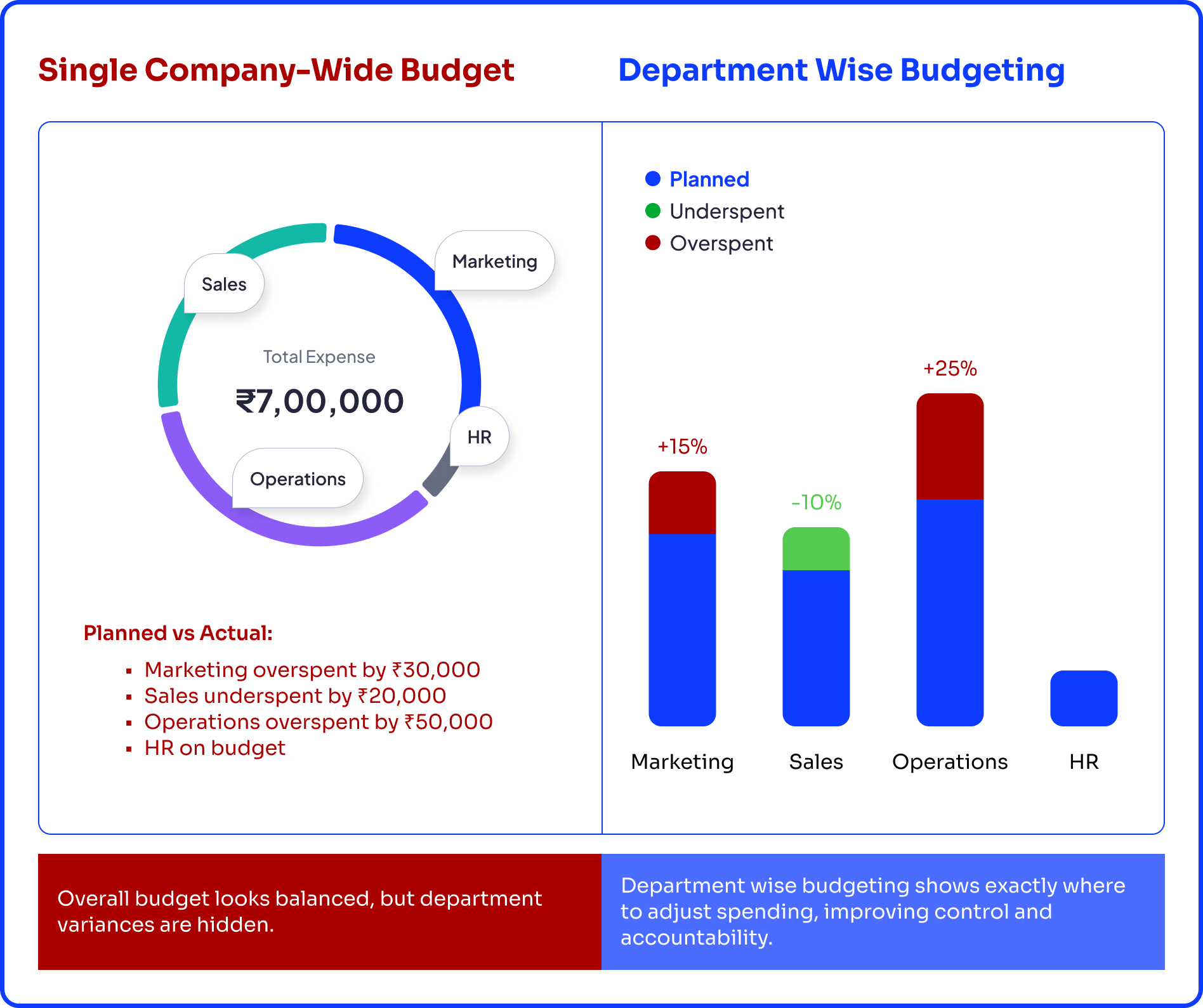 Department-wise budgeting solves these problems by allocating specific budgets to each department, along with clear spending limits and goals.
