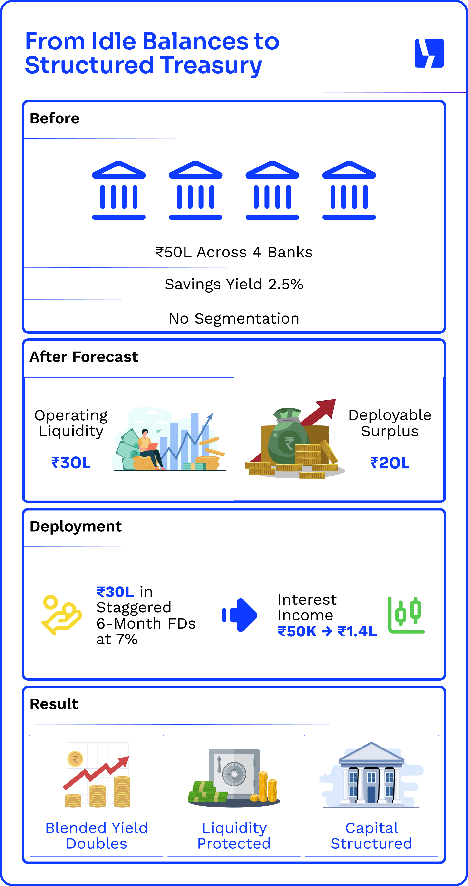 Take a business holding ₹1 crore across accounts at an average 3% savings rate. That earns ₹3 lakh a year. With better forecasting, it realizes ₹60 lakh is enough for operations, while ₹40 lakh stays unused for at least 90 days.