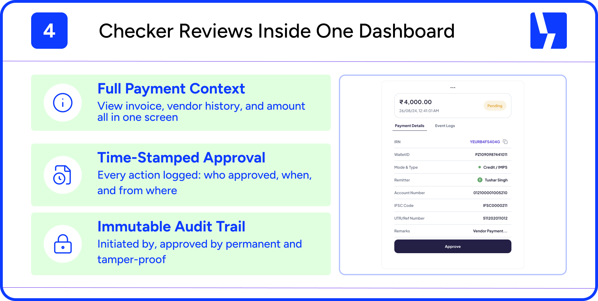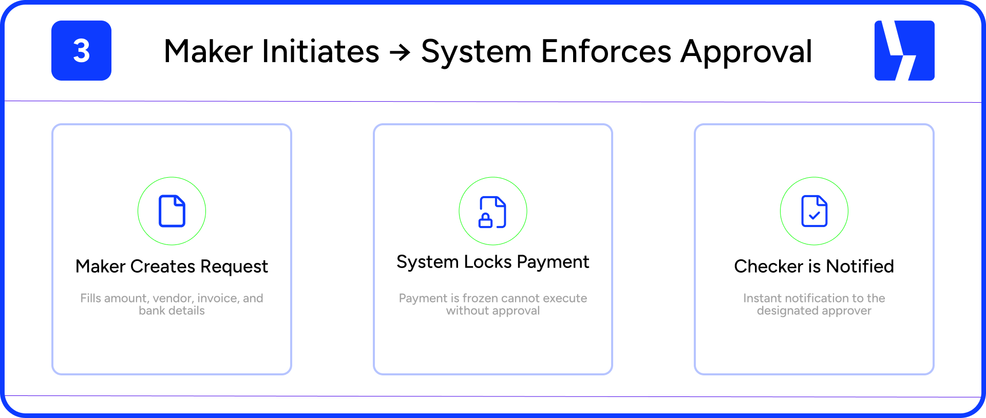 The maker–checker principle remains unchanged, but enforcement becomes system-driven rather than dependent on chats or recollection. Approvals require designated authorization within a structured workflow, with clear role definition and recorded validation. As transaction volumes increase, the process remains stable instead of becoming strained.