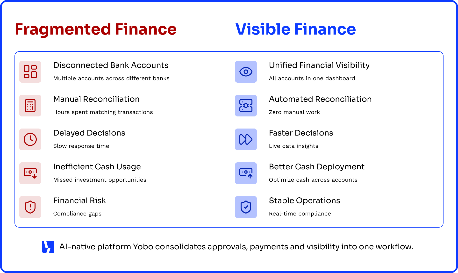 The first risk is delayed decisions. Payment approvals often wait while teams confirm balances across accounts. This slows operations and creates unnecessary friction.