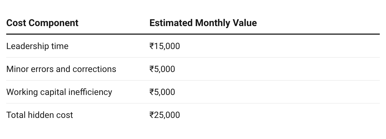 Together, these hidden costs add up: leadership time is lost, mistakes rise, cash flow suffers, and the team becomes stressed.