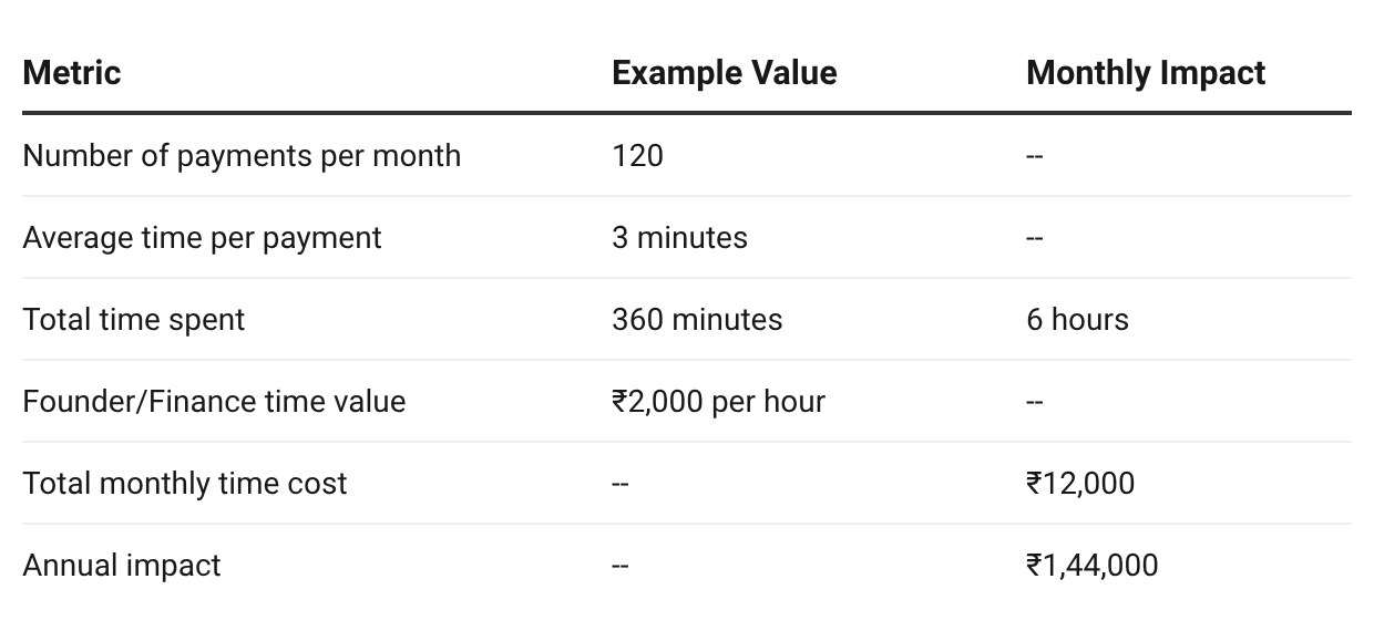 This table shows only the direct time spent. Follow-ups, corrections, and month-end checks are extra. Manual payments turn leadership time into admin work, costing hours that could be spent on strategic tasks.