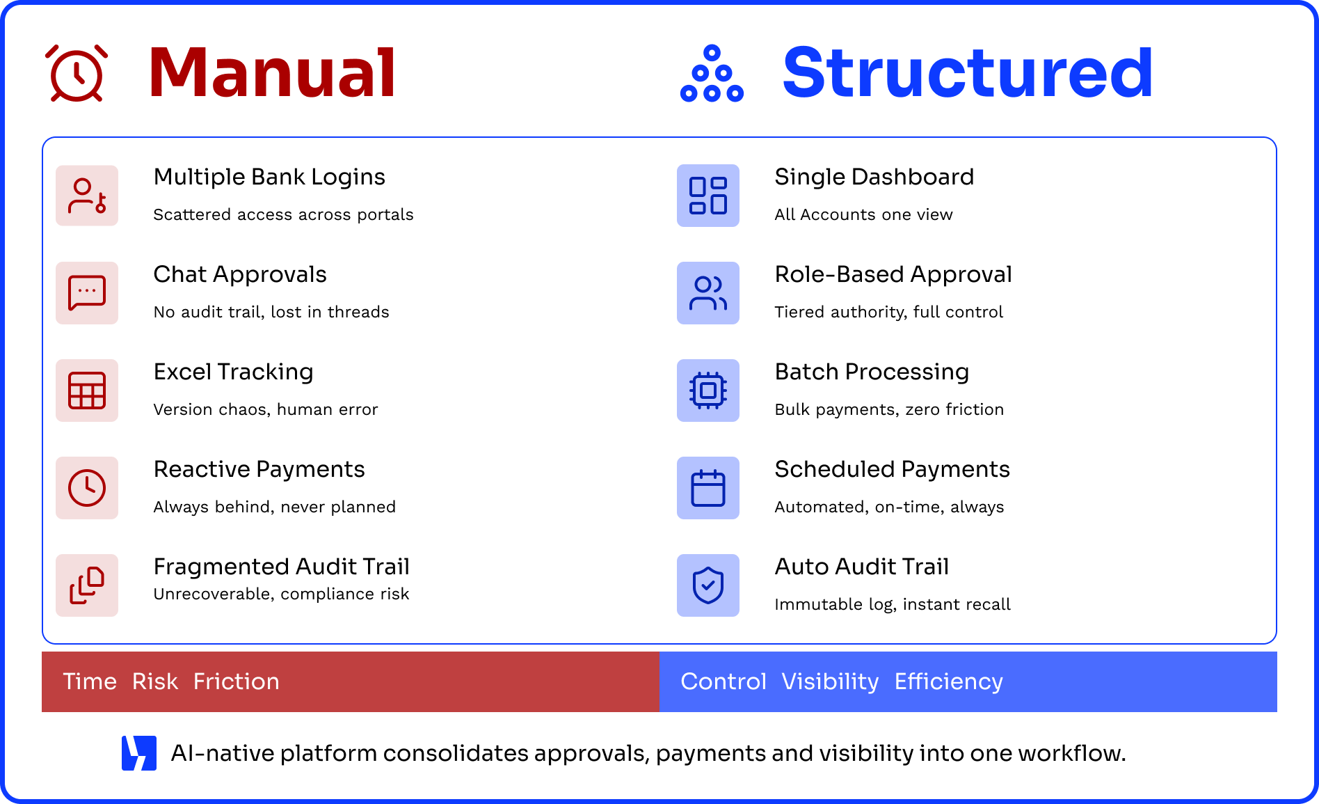 Manual payment timing rarely aligns with the business’s liquidity planning. Payments may go out too early, reducing the benefit of agreed credit periods, or too late, creating tension with vendors and affecting long-term trust. Many teams lack a full view of balances across multiple accounts before releasing payments, which causes cash to leave the business reactively rather than strategically.